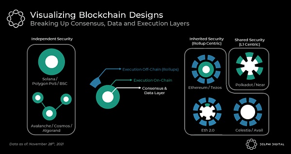 Avalanche(雪崩)、Cosmos和Algorand等多链hub最适合独立安全模块,而以太坊、波卡(Polkadot)、Near和Celestia(一种相对较新的L1设计)则设想了最终共享或继承彼此安全性的模块。